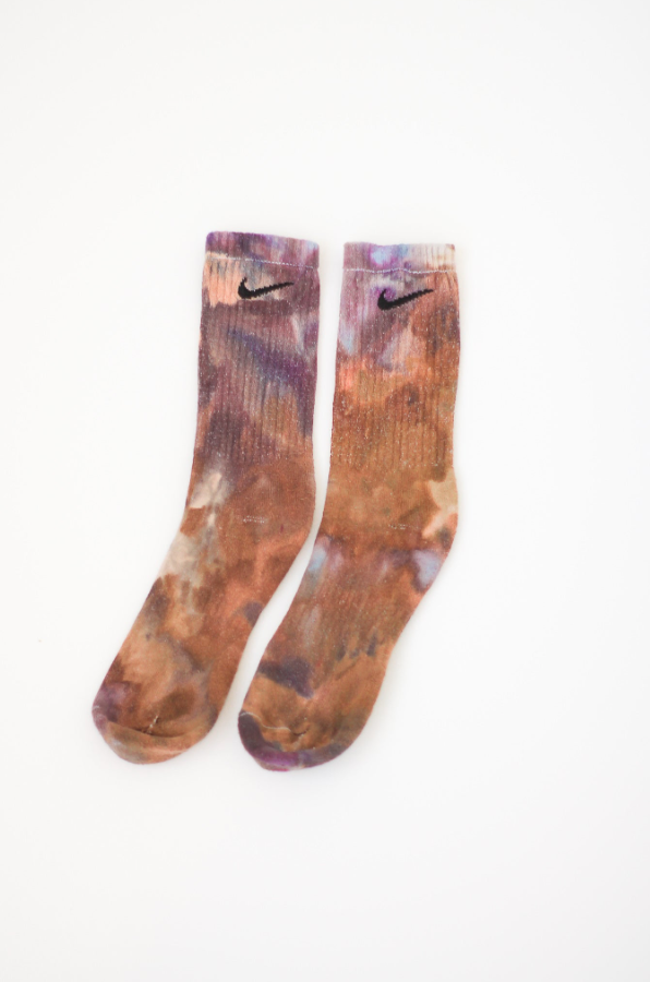 Nike Dry-Fit Socks add a welcome pop of color to your fit. These socks have a super comfy cushioned foot bed without being too thick and look great in both sneakers and boots. Crew height and universal fit (yup, one size fits most men AND women).Hand dyed with low impact dyes. Each pair unique.