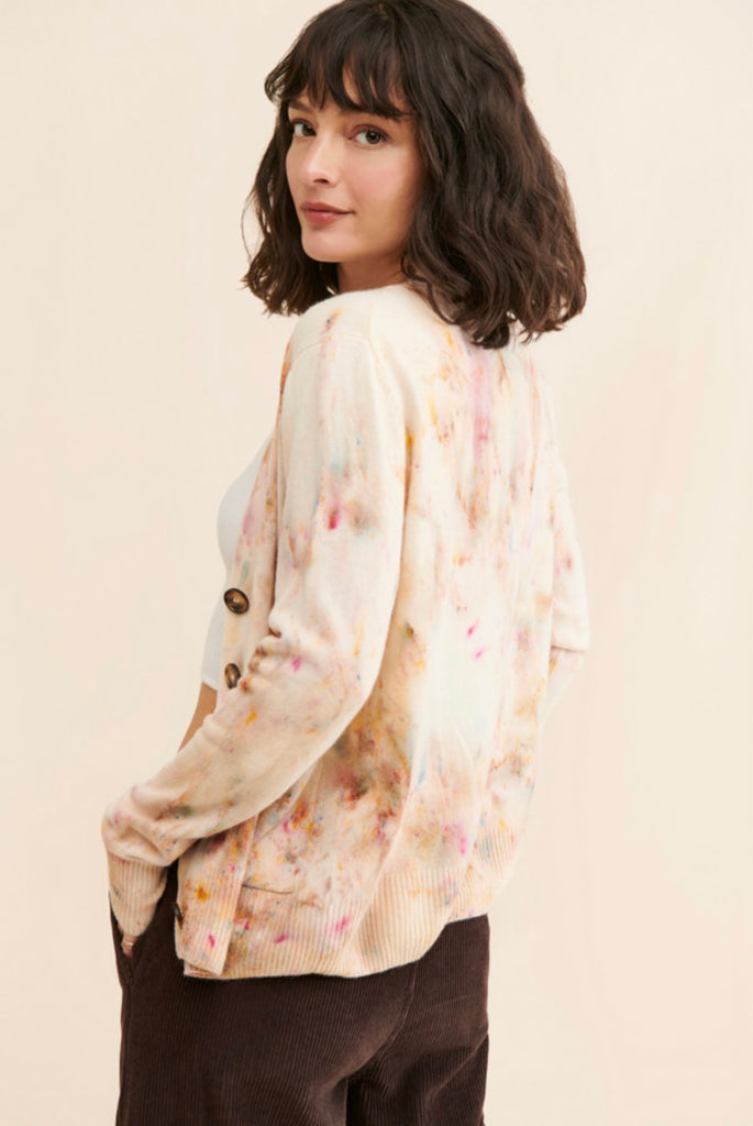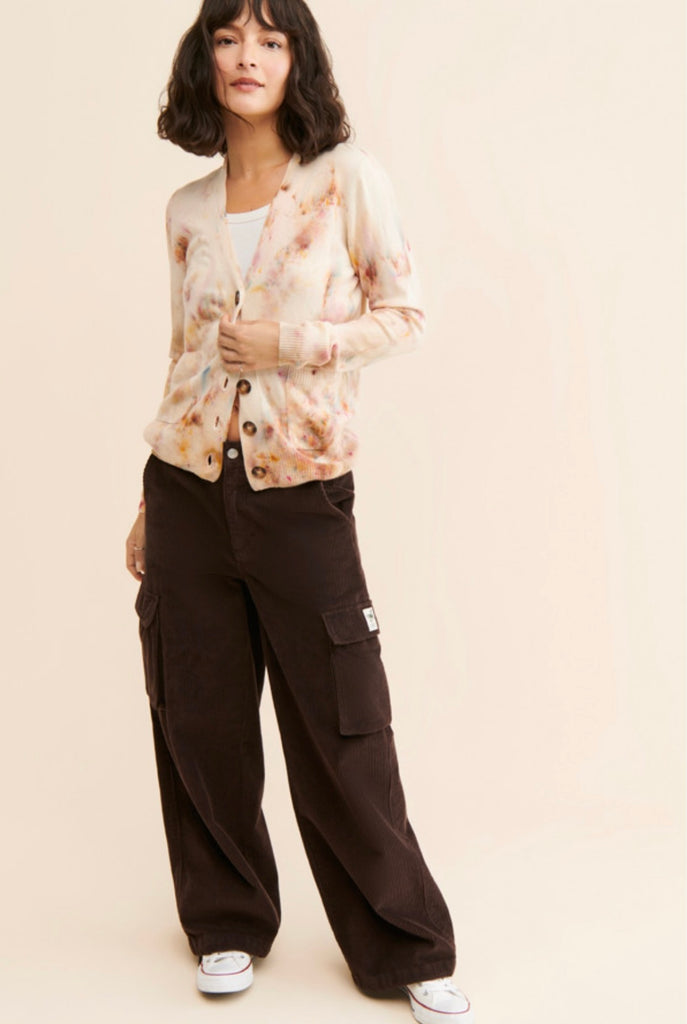 Updated classic this super soft long sleeve cashmere and wool blend cardigan features a button closure at front, rib knit collar, cuffs, and hem. Dropped shoulders. Oversized fit.