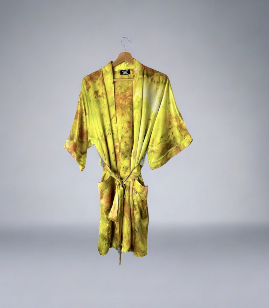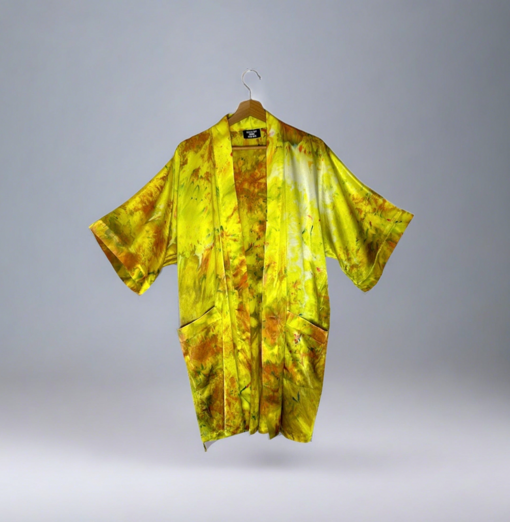 Silk Kimono Jacket with attached belt loops at the waist. Unisex and made to accommodate a variety of sizes. Rolled and stitched hems.
