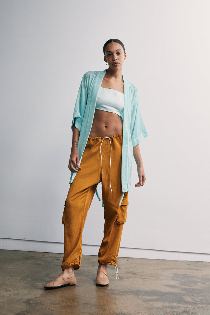 Each piece is individually hand-dyed, creating a unique color and pattern variation that adds a touch of exclusivity to your wardrobe. The kimono features attached belt loops at the waist, allowing for easy styling and a personalized fit.