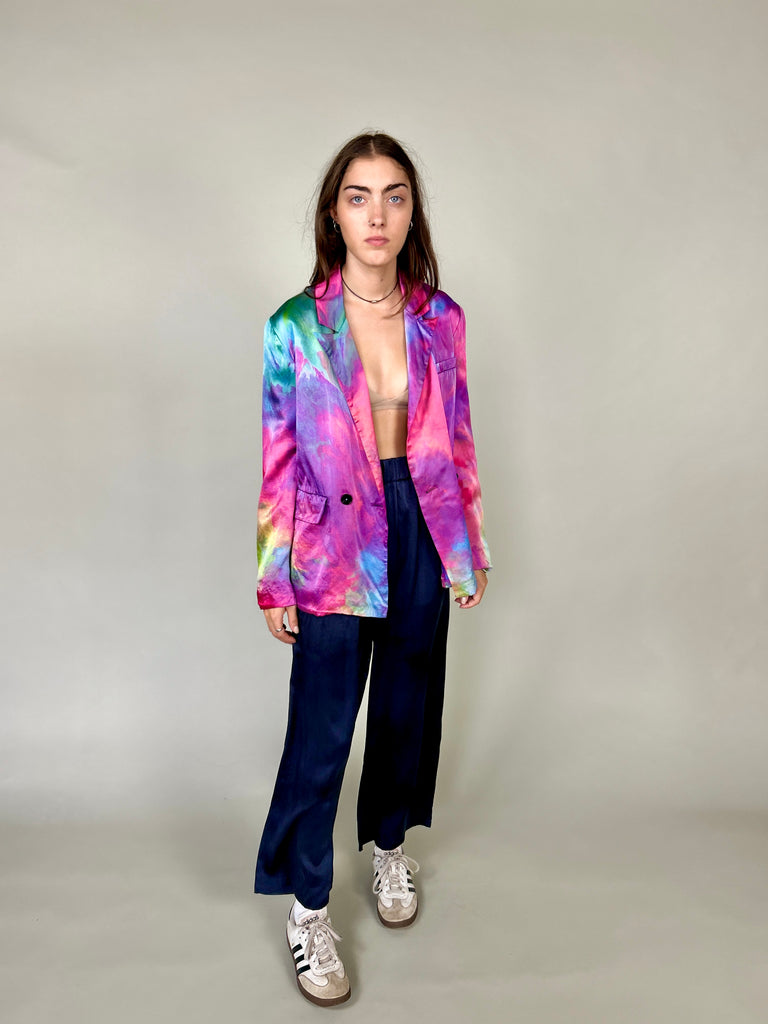 This Silk Blazer is the perfect addition to any wardrobe. Made from 100% silk with silk twill lining, it offers a luxurious and elegant look. The blazer features a silk lining for added comfort and a smooth feel against the skin. The oversized fit adds a touch of modernity to the classic blazer style, making it a versatile piece that can be dressed up or down.
