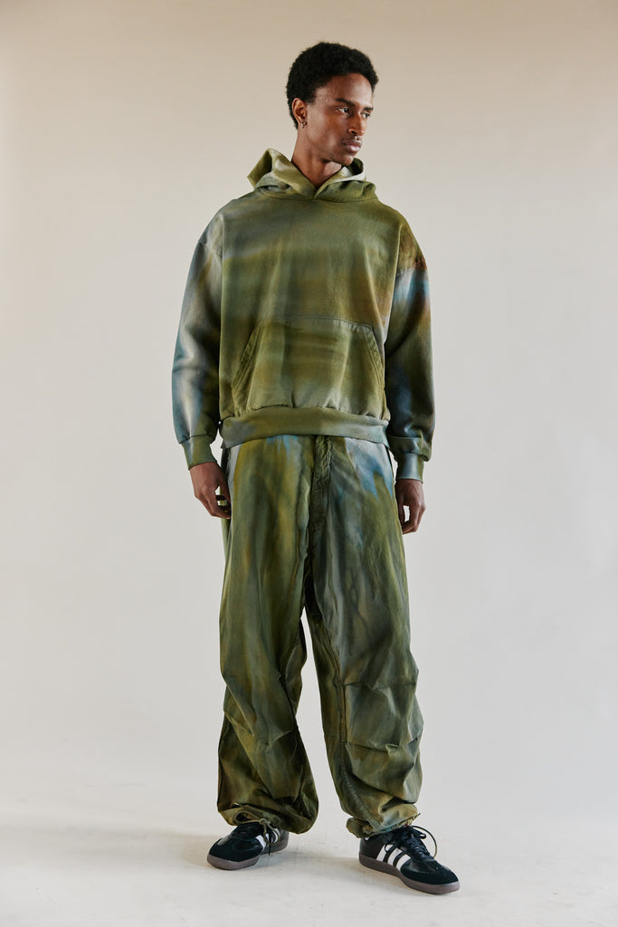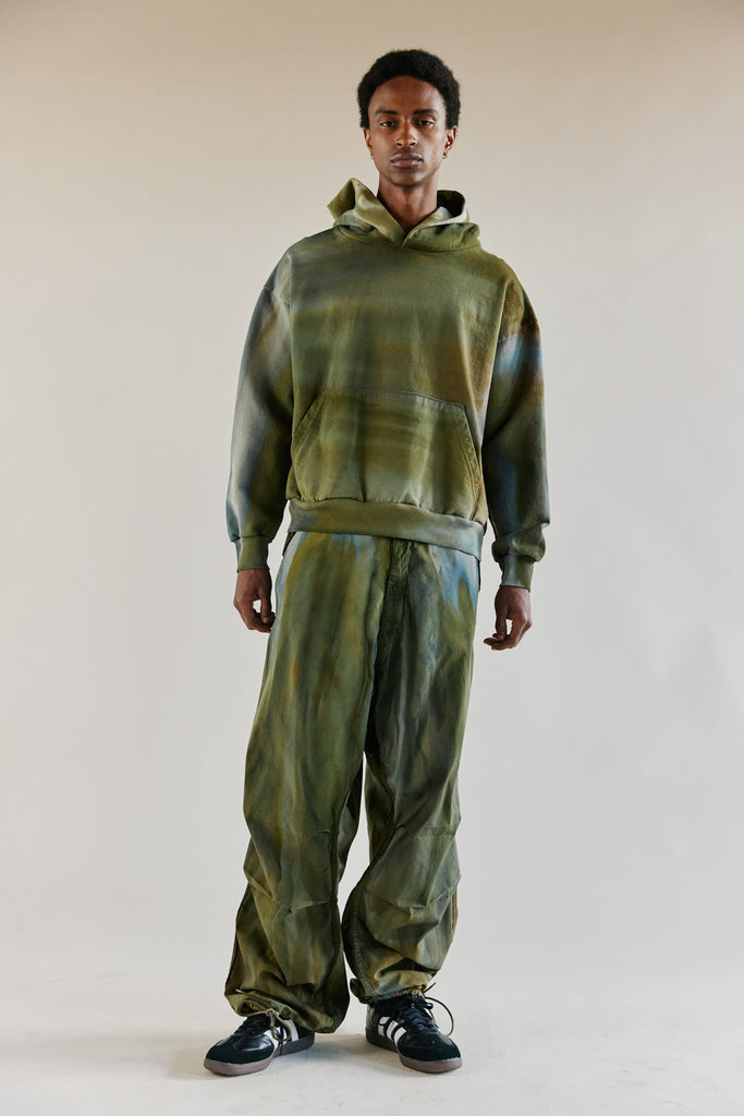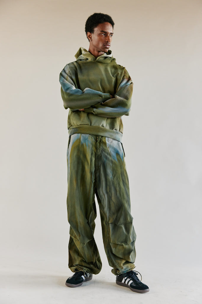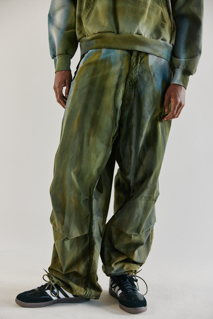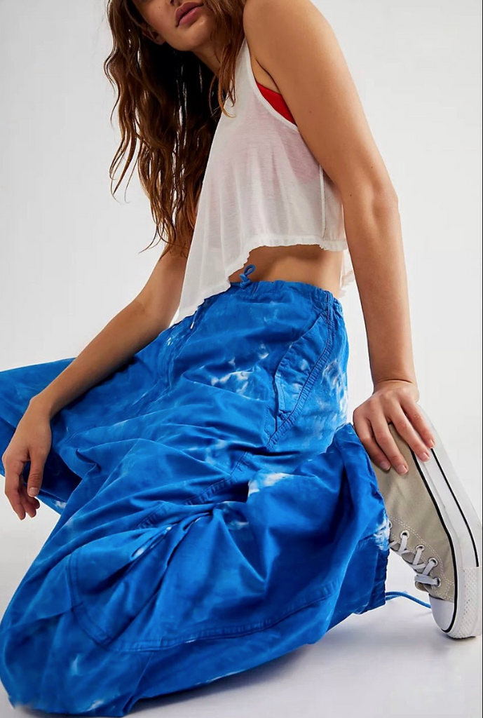 Features: Bungee detailing at the waistband, hand-dyed washed fabrication, side pockets, banded hemlines