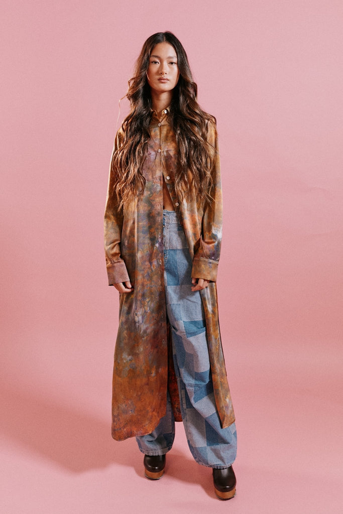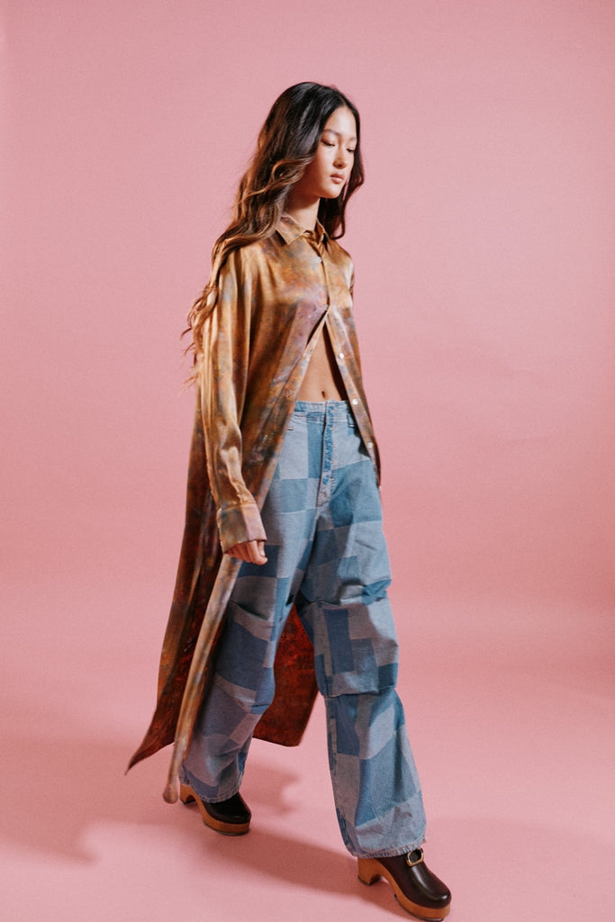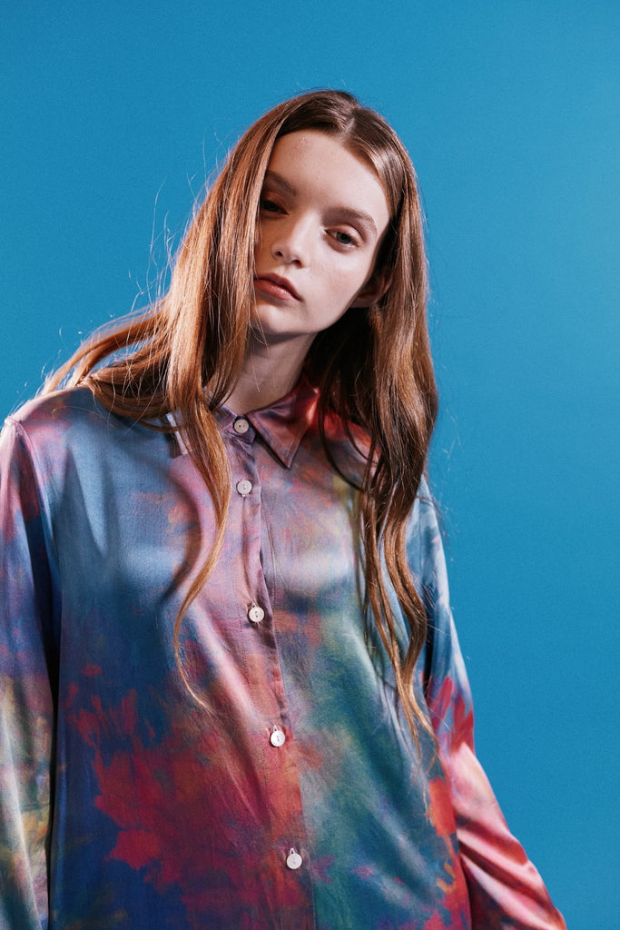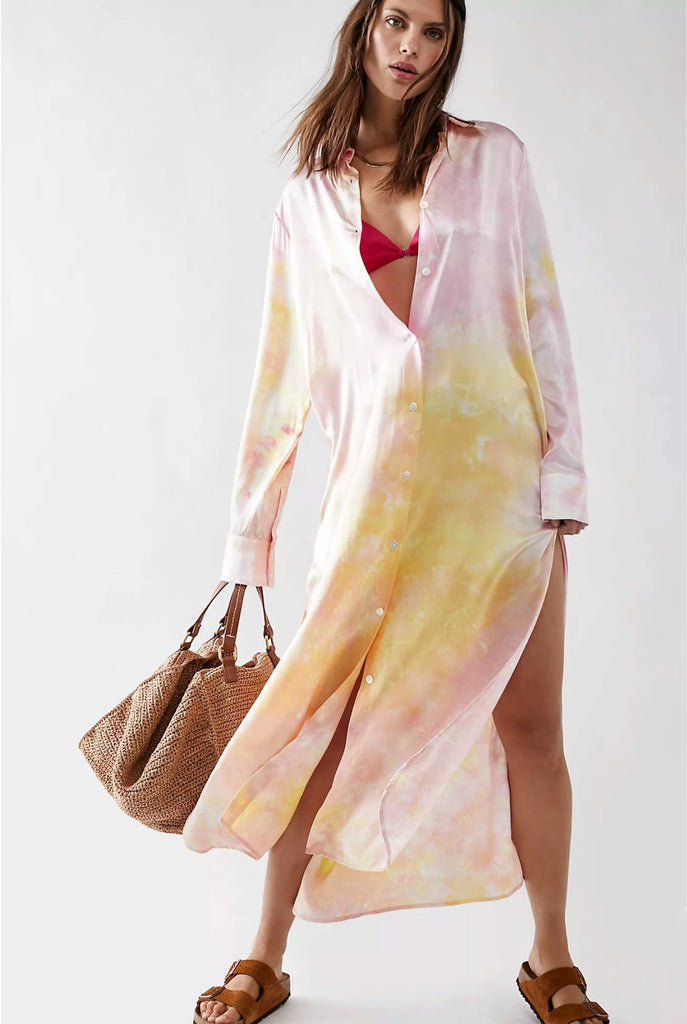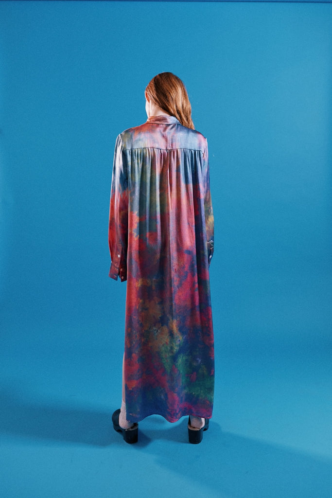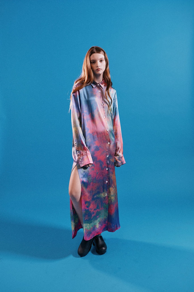 The Silk Maxi Buttondown in Rainbow is a stunning piece that effortlessly combines a classic silhouette with a vibrant, tie-dye print.