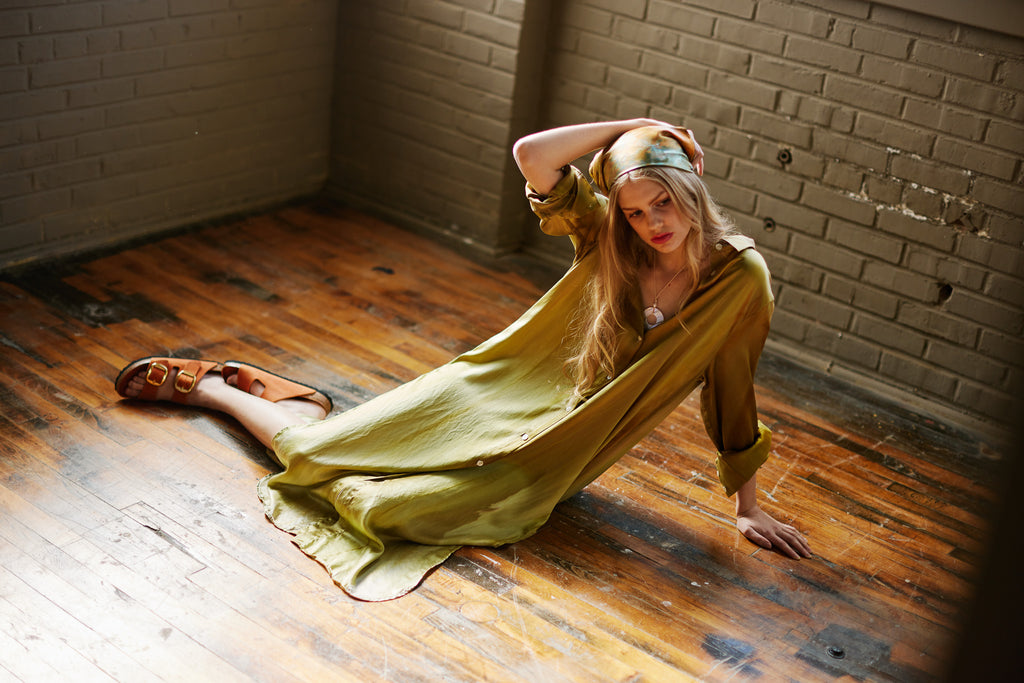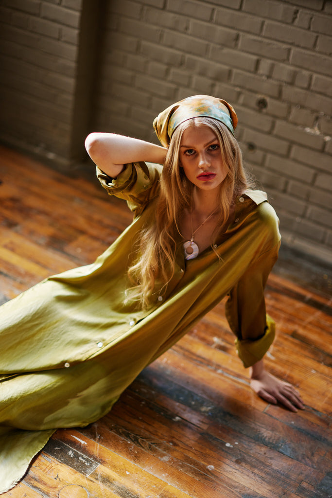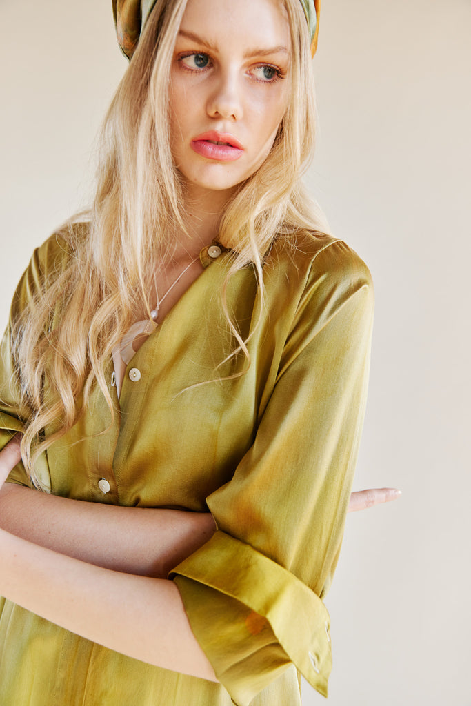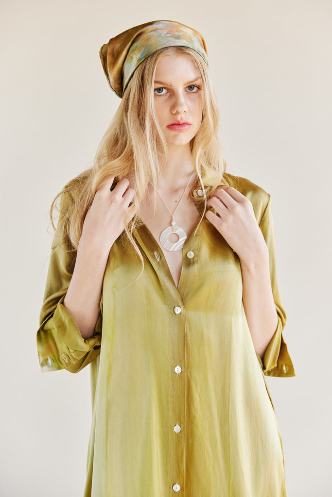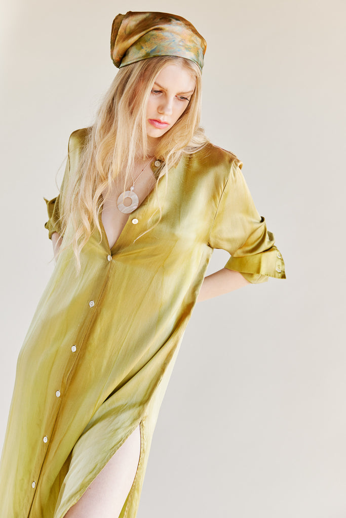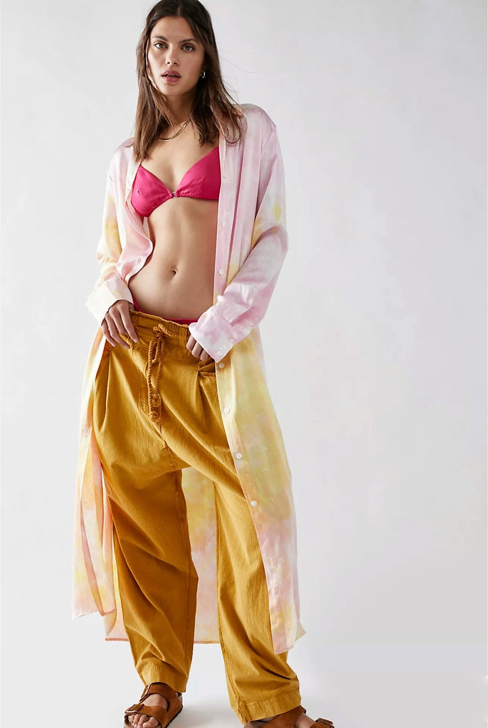 The Silk Maxi Buttondown in Rainbow is a stunning piece that effortlessly combines a classic silhouette with a vibrant, tie-dye print.