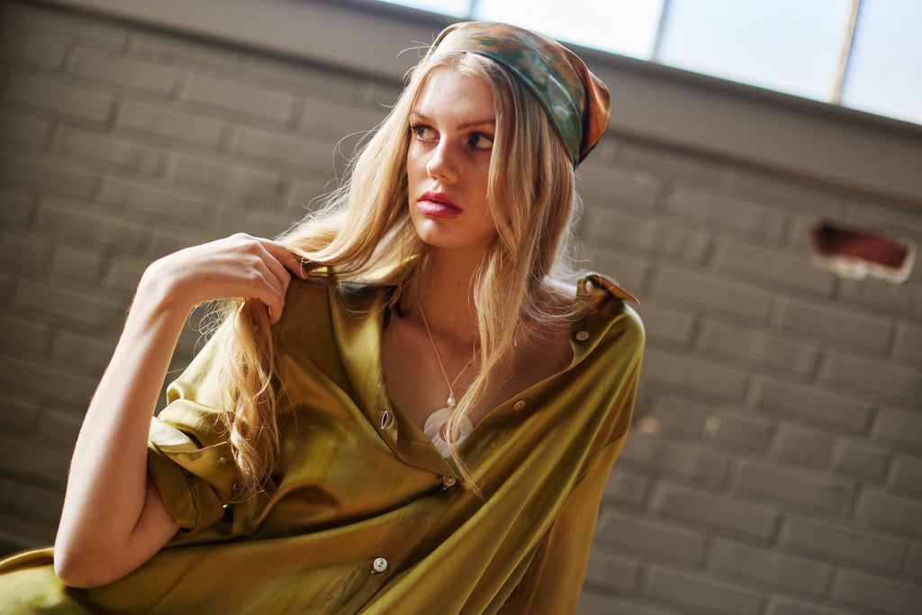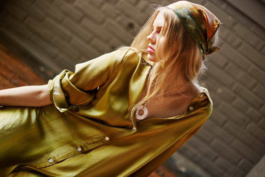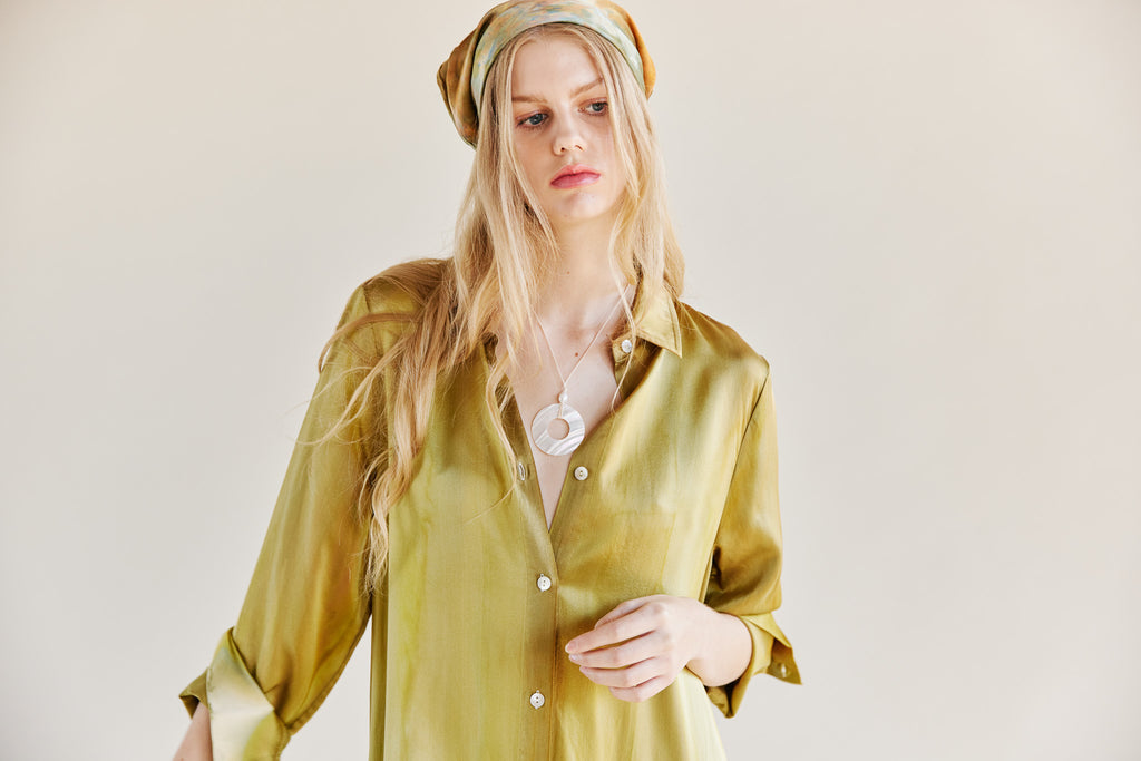 Relaxed and drapey fit, the top features a classic collar and button-front closure, along with exaggerated side slits for a modern twist.