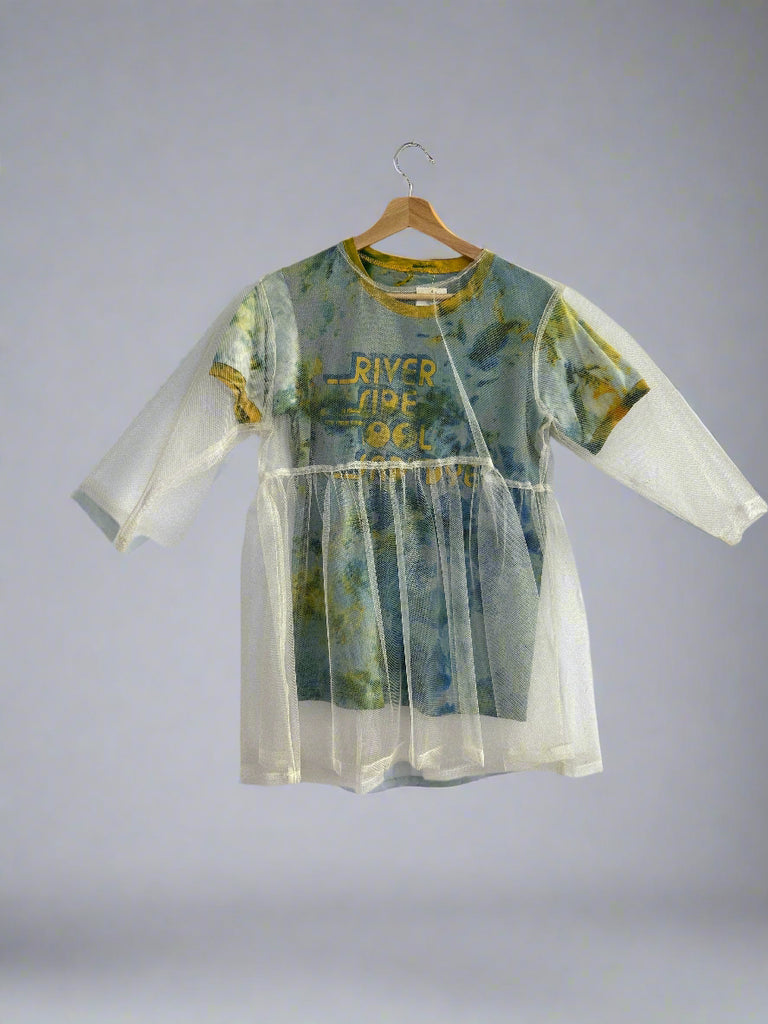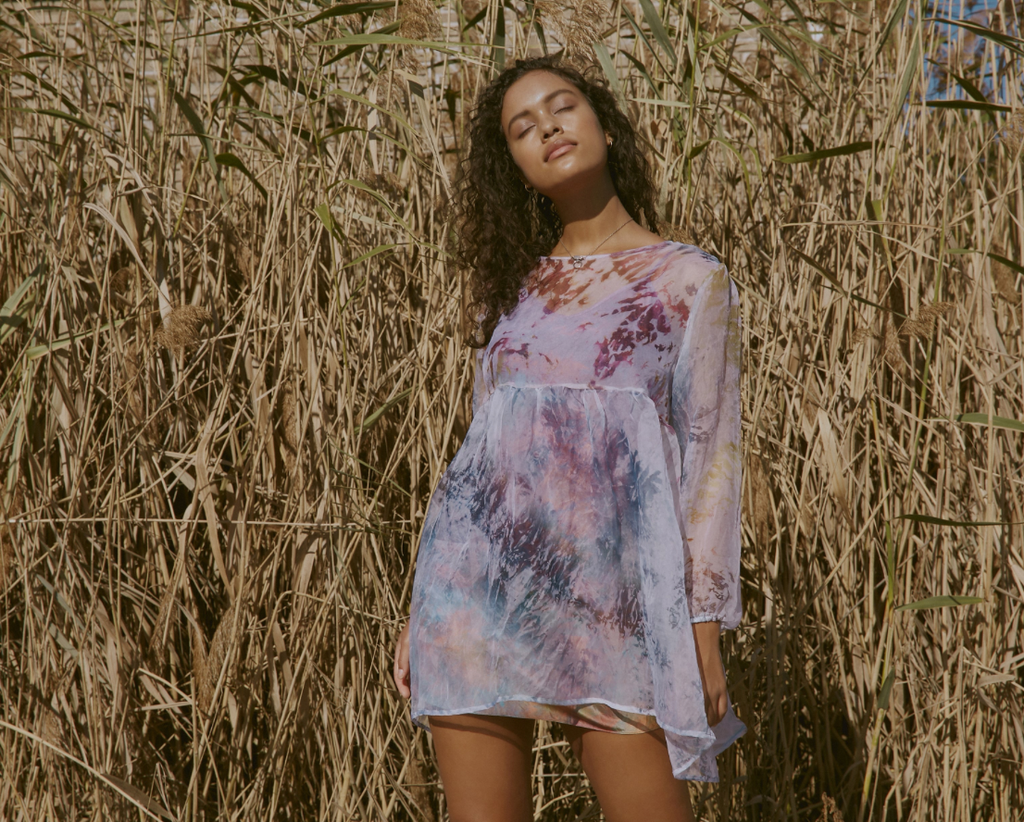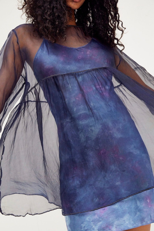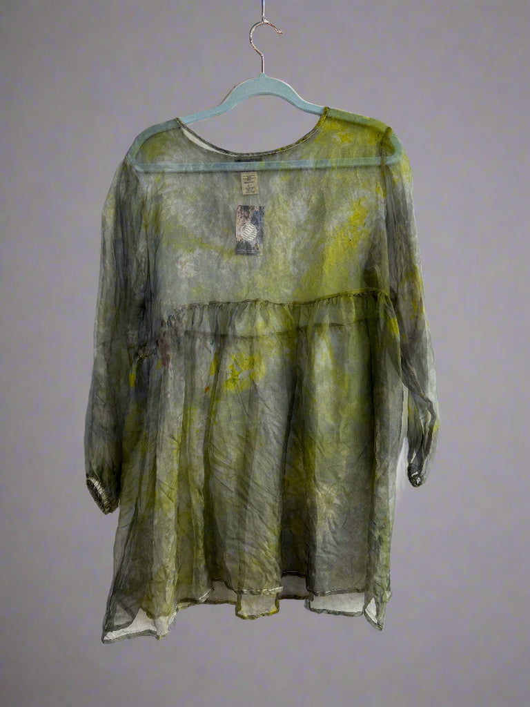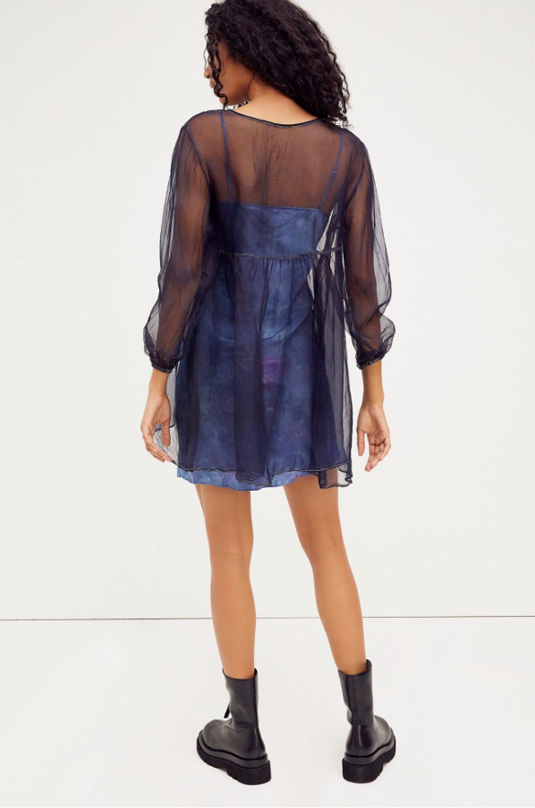 Updated babydoll dress with gathered empire waist, 3/4 sleeve, in an oversized silhouette.