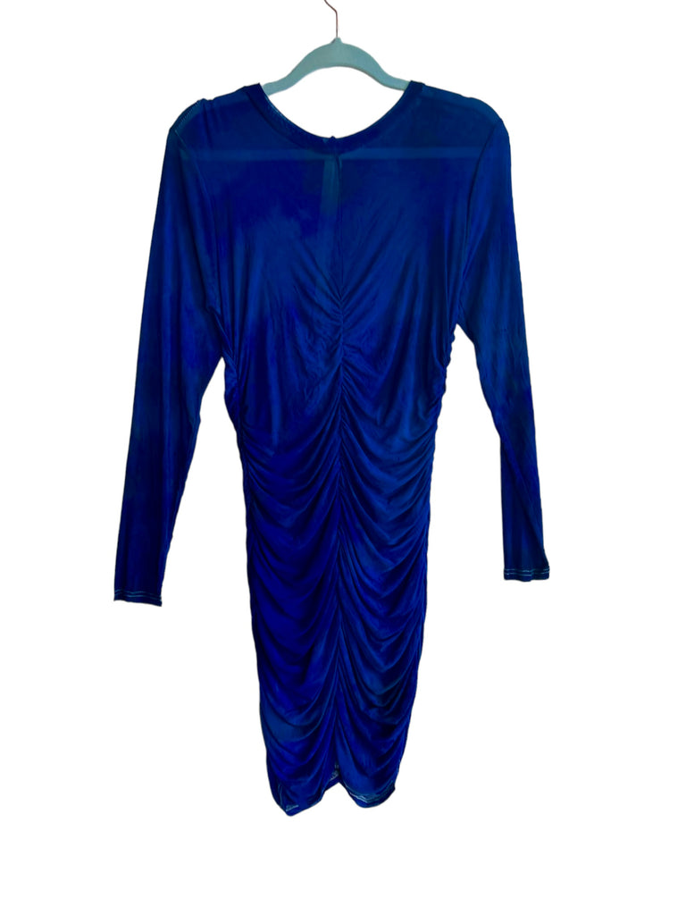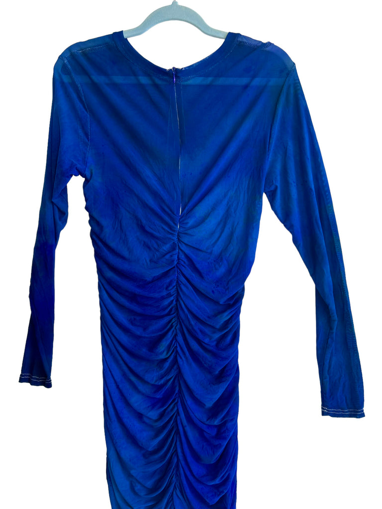 Semi Sheer nylon dress with a subtle dye. Asymmetrical ruching detail makes this dress ultra flattering. Hidden back zipper.