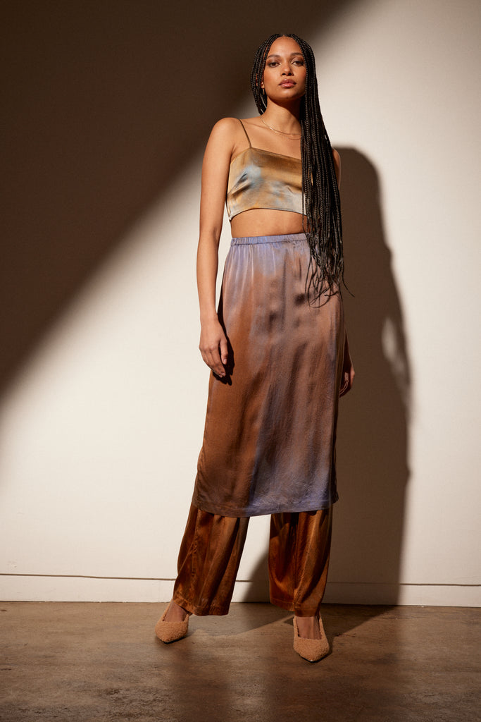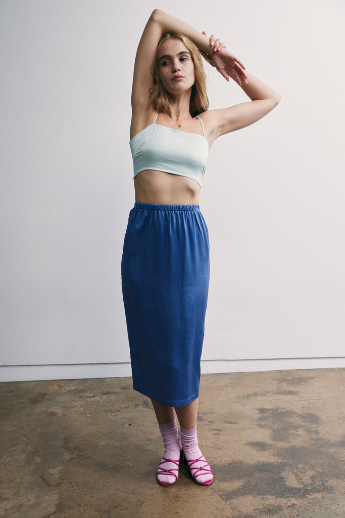 Classic mid-length skirt with elastic waist in a subtle dye effect.
