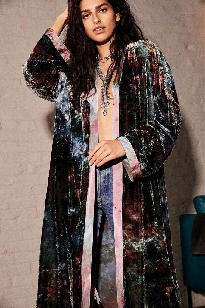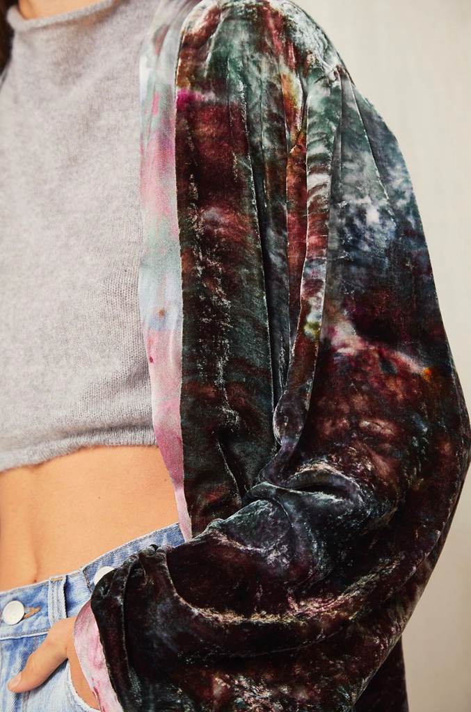 The Velvet Duster in Obsidian is a standout piece, featuring a unique tie-dyed velvet fabrication. This kimono is designed with a classic wide-sleeve, longline silhouette, adding a touch of elegance to any outfit. The contrast hem further enhances its visual appeal, providing added dimension to the overall design.
