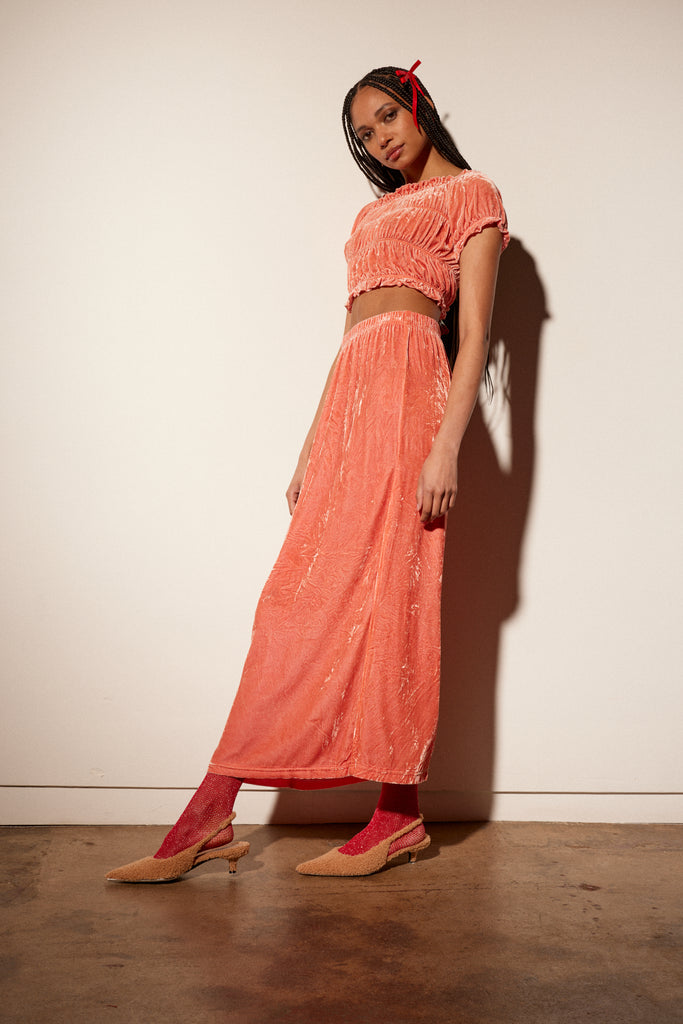The Velvet Ruch Top in Apricot is a stylish and versatile piece that will elevate any outfit. This fitted crop top features an allover elastic cinching, creating a flattering and comfortable fit. Made from high-quality velvet material, this top is soft to the touch and adds a touch of luxury to your wardrobe. It can be dressed up or down, making it suitable for a variety of occasions. For easy maintenance, simply machine wash separately on delicate and hang dry. For added fluffiness, tumble dry on low heat. Add this must-have top to your collection today!